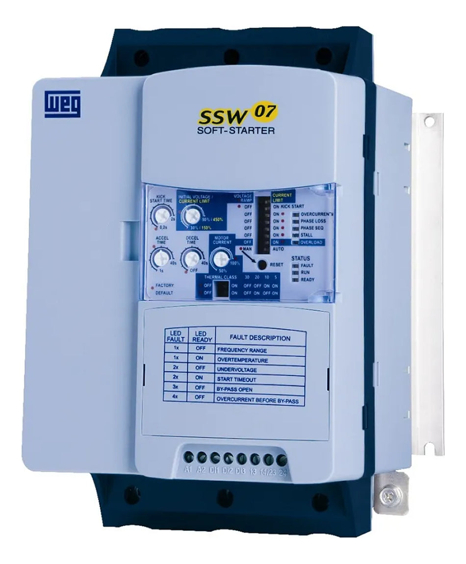 Soft-Starter WEG são chaves de partida estática, projetadas para aceleração, desaceleração e proteção de motores de indução trifásicos. O controle da tensão aplicada ao motor, por meio do ajuste do ângulo de disparo dos tiristores, permite obter partidas e paradas suaves. Com o ajuste adequado das variáveis, o torque produzido é ajustado à necessidade da carga, garantindo, desta forma, que a corrente necessária seja a mínima necessária para a partida.
